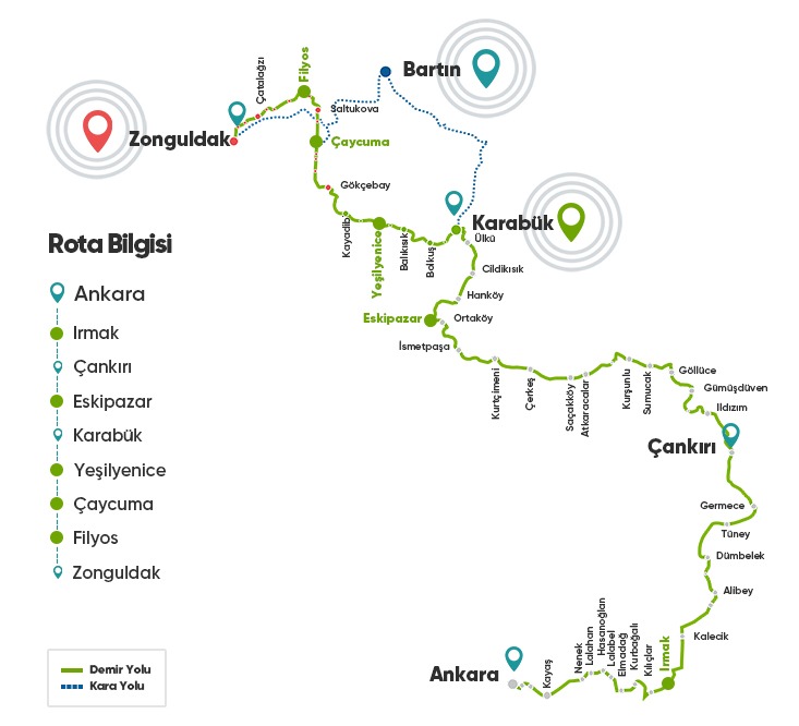 Ankara-Karabük-Zonguldak arasında 484 km’lik tek hatlı demiryolu bulunmaktadır. Hattın Irmak-Karabük-Zonguldak arasındaki 415 km’lik kısmı rehabilite edilerek sinyalizasyon altyapısı iyileştirilmiş, yolcu peronları engellilerin erişimine uygun hale getirilmiş ve hat Avrupa Birliği standartlarına getirilmiştir. Demiryolu hattı yük taşımacılığının yanında yolcu taşımacılığında da kullanılmaktadır.